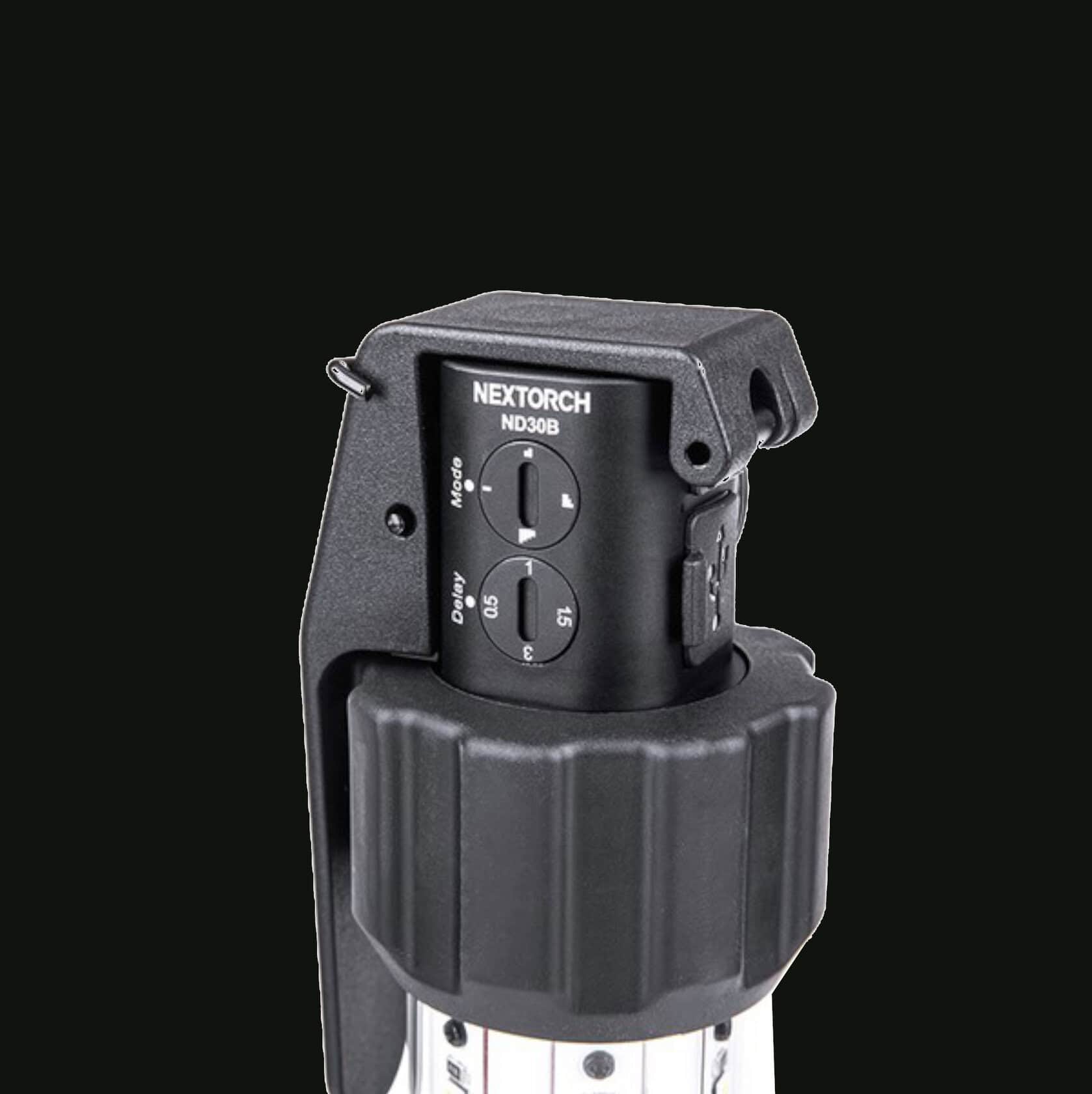 Der NEXTORCH ND30 wurde als Alternative zu bisherigen Flashbangs entwickelt. Der ND30 gibt keinen Knall ab, sondern blitzt mit 11.000 Lumen und irritiert mit einem schrillen 130dB Alarm-Ton.
